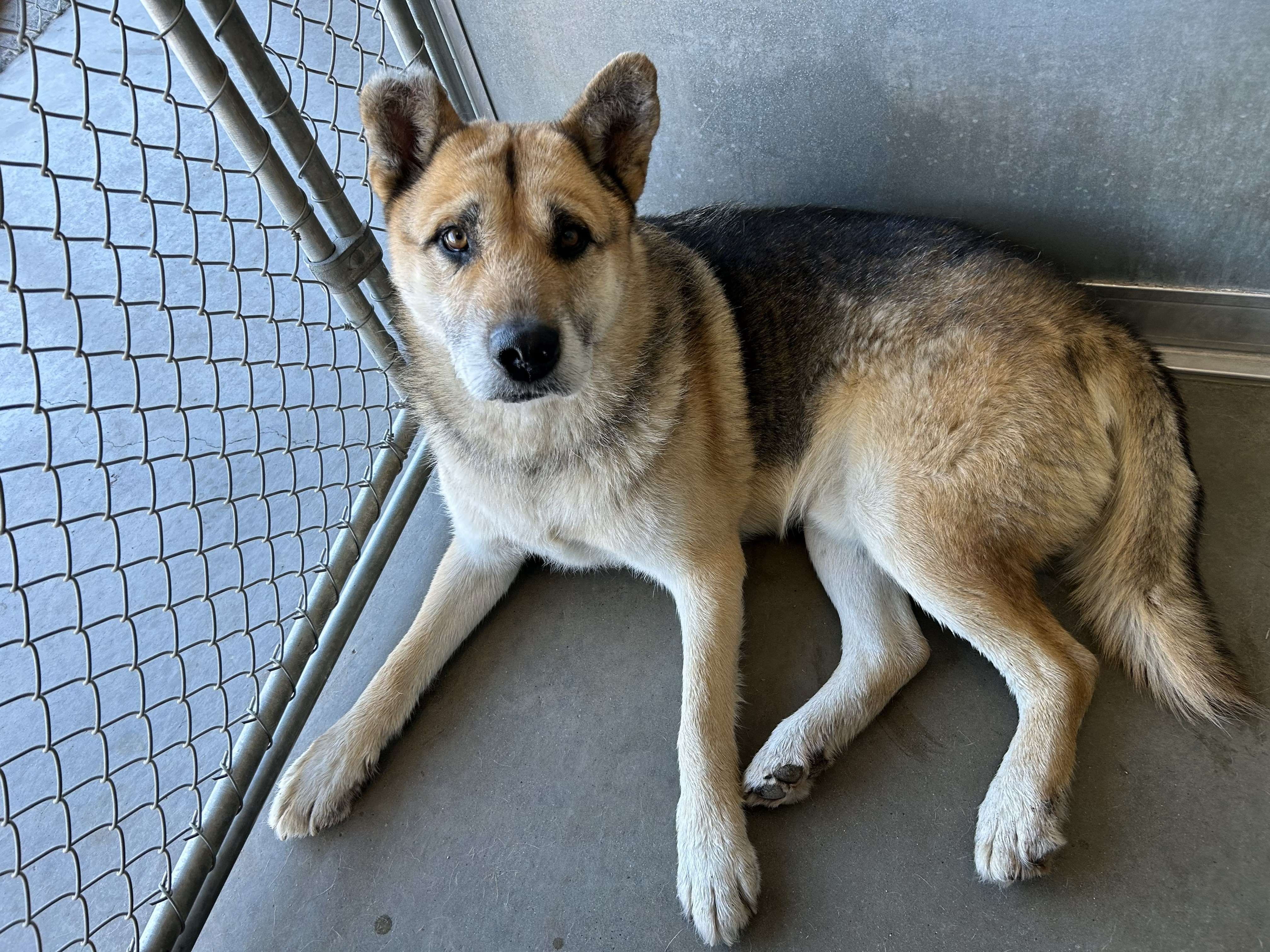 senior male shepherd mix, approximately 6 years old, 70 lbs